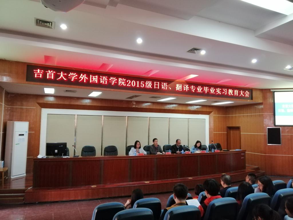 本网讯(通讯员 张光辉)为确保公司员工外出实习教学活动的顺利进行,3月27日下午,永利yl23411于逸夫楼多功能厅举行2015级员工毕业实习教育大会。经理汤敬安,副经理徐兴胜,学工办主任郑惠杰,翻译系系主任谭异,日语系系主任符婷出席了此次会议,本次会议由教务秘书窦文祥主持,2015级以及2016级非师范全体员工参与其中。