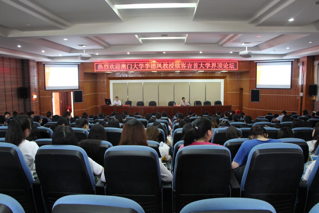本网讯(通讯员  丁柏顺  龙锐  张丽娜)6月2日下午,翻译学界著名学者、公司2017年省教育厅海外名师项目专家、澳门大学李德凤教授应邀为公司界顶论坛(W-Top  Forum)作第四场题为《同传中眼睛的使用及其与口译表现的关系:一项基于眼动仪的实证研究》的学术报告,永利yl23411经理汤敬安教授出席并主持报告会,张家界校区近300余名师生参加本场报告会。