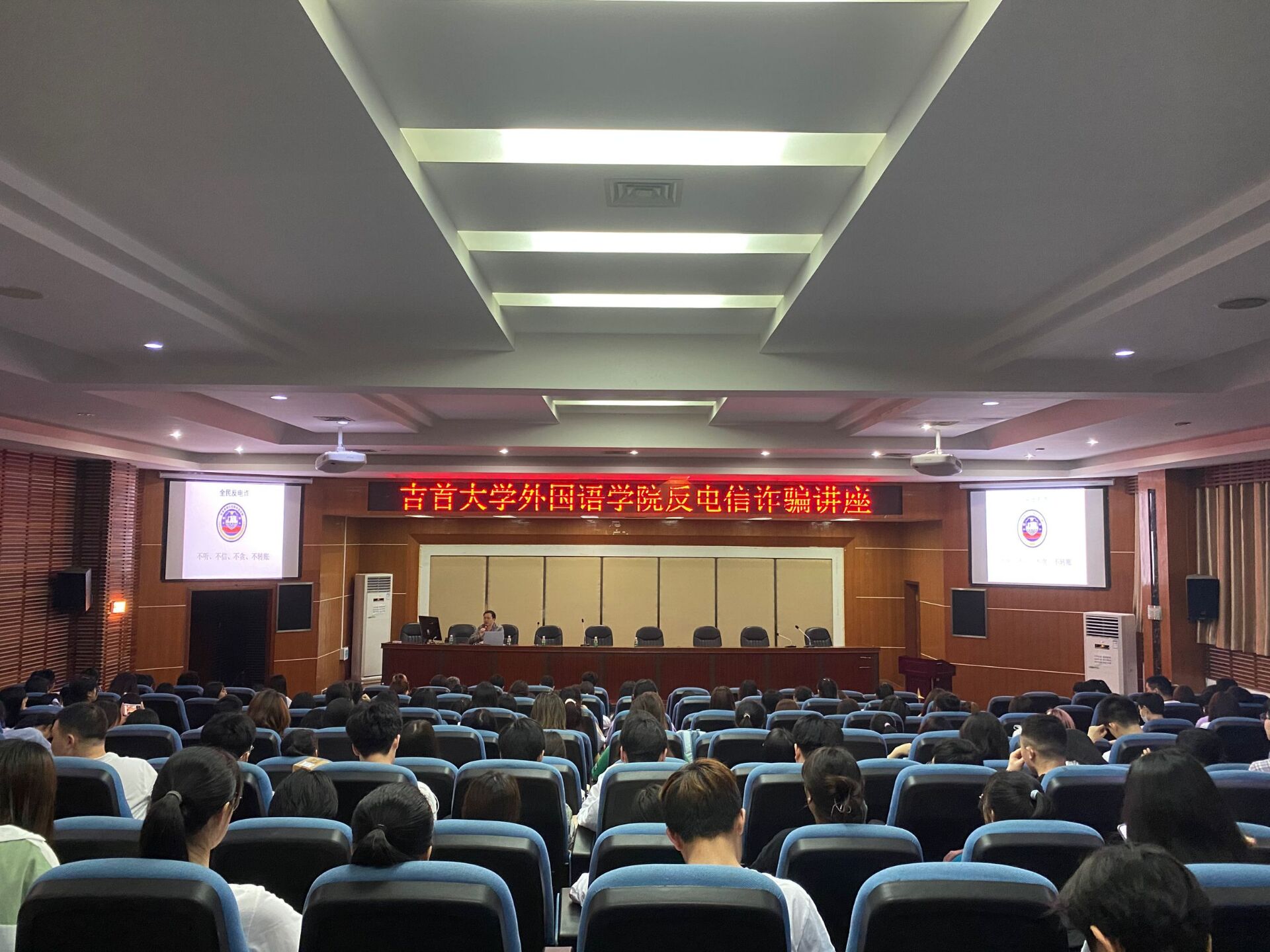 本网讯(永利yl23411供稿)5月12日晚,永利yl23411和张家界校区后勤与保卫处、永定区公安分局大庸桥派出所在逸夫楼学术报告厅举行“我为师生办实事--反电信诈骗讲座”,黄婷警官主讲,近300名师生接受教育。