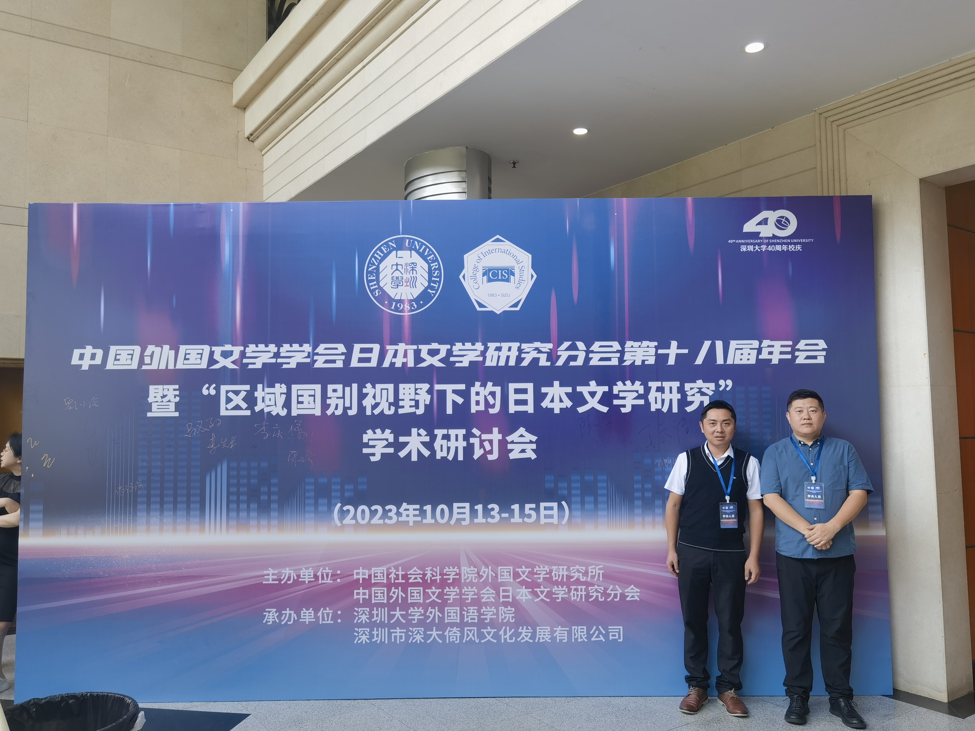 2023年10月13-15日,第十八届中国外国文学学会日本文学研究分会年会暨“区域国别视野下的日本文学研究”学术研讨会在深圳大学举行。本届年会暨学术研讨会由中国社会科公司外国文学研究所、中国外国文学学会日本文学研究分会主办,由深圳大学永利yl23411等单位承办,永利yl23411丁跃斌副经理及潘贵民博士参加了此次年会暨学术研讨会。