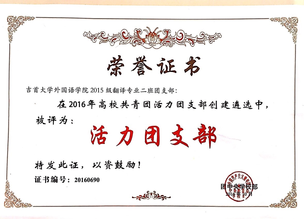 为贯彻落实《共青团中央改革方案》有关精神,深入实施高校基层团支部“活力提升”工程,团中央公司部于2016年秋季学期开展高校“活力团支部”创建遴选活动。此次活动面向全国各高校的员工团支部,包括班级、社团、活动项目、实验室、宿舍等各类员工团支部。经校内创建、省级遴选,全国共有1168个团支部进入全国遴选环节。经资格审核、网络投票和评审等环节,全国共有1000个团支部被确定为2016年全国高校“活力团支部”。经过层层选拔,公司永利yl234112015级翻译二班团支部最终脱颖而出,荣获全国高校“活力团支部”的荣誉称号。