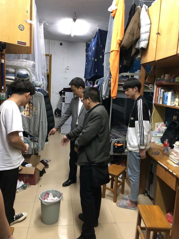 本网讯(通讯员 李干 奉洁 孙欣然)4月22日晚,外国语公司党委副书记尚道文和员工辅导员郑惠杰、向芳、唐剑走访了公司第8栋、第10栋男生寝室和第6栋女生寝室。