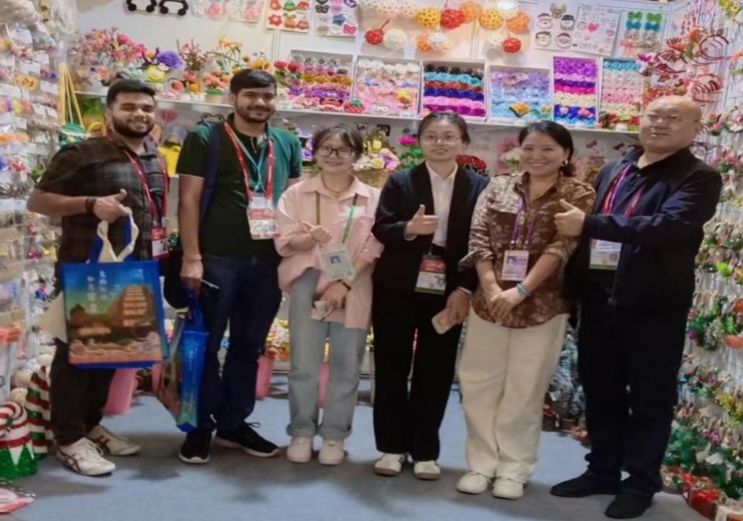 在锦汉家居礼品展上,同学们敏锐捕捉到客商对于产品独特的需求,为其提供精准推介。察觉到一批印度客人对独特文化产品的兴趣后,同学们主动为其推荐绣球、仿真花、无纺布工艺品等富有地域特色且创意十足的物件,并用流利英语的介绍产品的文化故事与制作工艺。客人们被深深吸引,随即与展商就产品细节与未来合作展开愉快的深度探讨。会谈后,客商不忘对同学们的专业素养与文化底蕴给予赞扬。