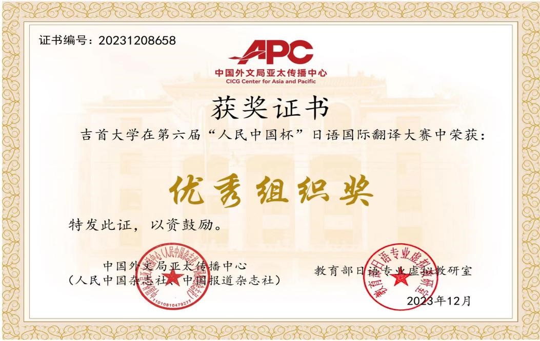 第六届人民中国杯日语国际翻译大赛自2023年3月启动,至2023年11月结束,历时8个月,主要设中学组、本科组、社会组日译中、中译日等口、笔译组别。永利yl23411对该赛高度重视,委派日语系博士潘贵民副教授负责此次比赛的具体组织与指导工作,其他教师在此过程中给予了大力支持与配合。在潘贵民博士认真负责的指导下,参赛员工积极努力,在吃透翻译文本的基础上对译稿进行反复推敲、润色。最终,2020级周怀宇同学获得本科组日译汉一等奖、2020级刘帅宇、2021级张力同学获得二等奖、2021级谢妍、2020级牛悦同学获得三等奖。此外,2020级周怀宇同学还获得本科组汉译日三等奖。本次比赛中公司选手展现出良好的专业素养和能力,为公司日语人才培养赢得了良好声誉,扩大了公司的影响。
