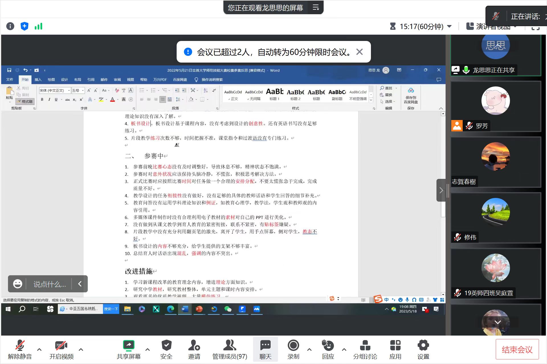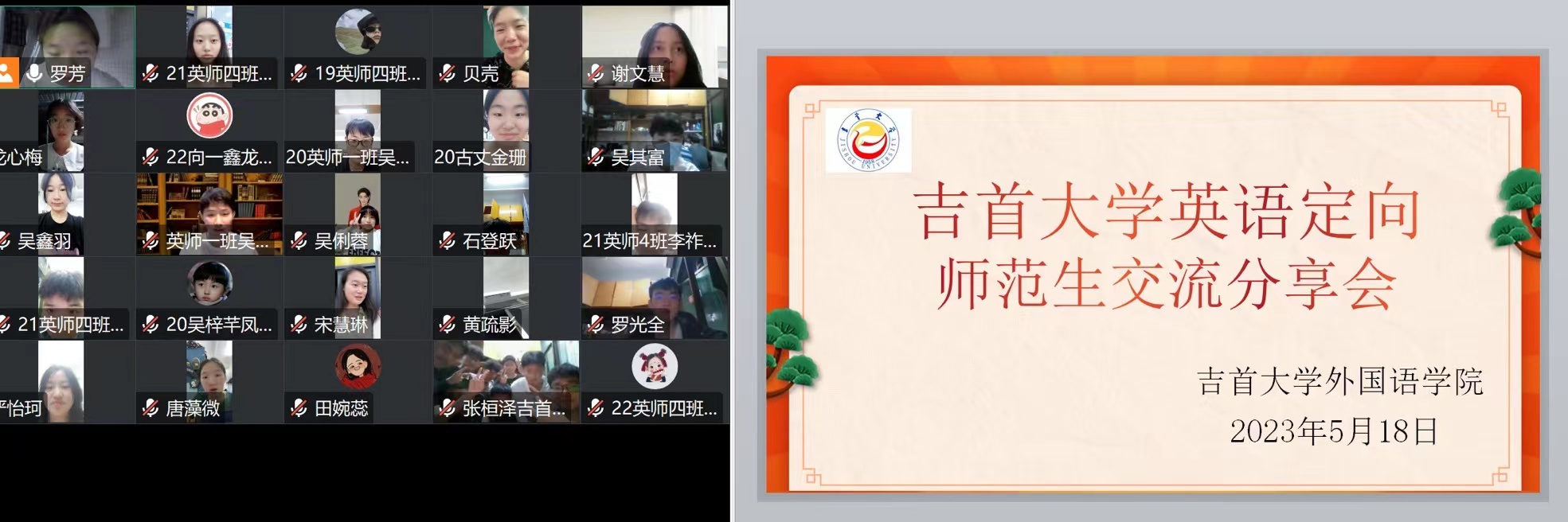 本网讯(龙思思,修伟)5月18日晚7:00,永利yl23411英语定向师范生交流会于线上如期举行,来自2019、2020、2021和2022级四个年级的英语定向师范生全员出席。会议邀请了即将毕业的2019级英语定向师范生代表就专业学习、语言技能训练、英语教师技能实践、专业见习与顶岗实习等做主题分享。